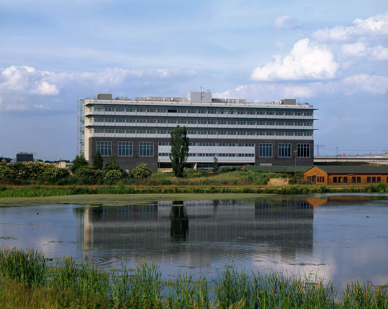 Die Service-Scheibe. Der Sockelbauteil sowie die darüber liegenden Raumgruppen werden in Längsrichtung von einer vertikalen Service-Scheibe durchdrungen. Dieser Gebäudeteil hat eine Tiefe von 3,60 m und eine Länge von 86,70 m. In ihm sind Installationsschächte, Sanitärräume, Technikräume sowie die vertikale Erschließung untergebracht.